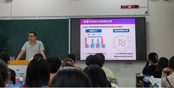 彭悦从工业烟气氮氧化物、挥发性有机物等多污染物协同控制等方面介绍团队最新研究进展,详细阐释了多污染物协同治理实现超低排放的环境治理的研究成果及发展方向,并对未来在移动源尾气净化等方面拟开展的工作进行展望。在提问环节,彭悦还结合自身研究经历讲述了如何开展好研究工作的心得与体会。报告会气氛热烈,师生受益匪浅。