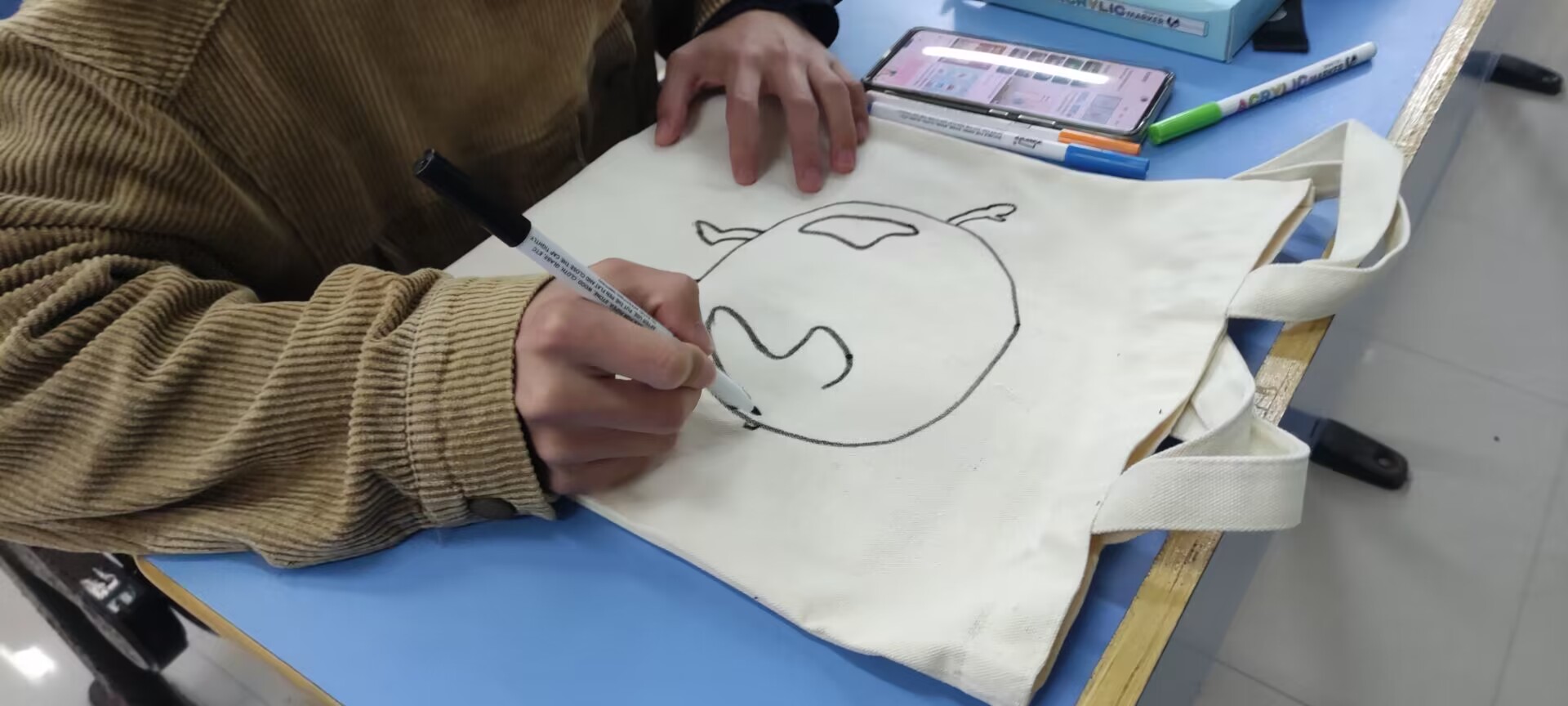 活动伊始,理事长曾小婷为大家分发帆布包和彩笔,同学们开拓思维,在购物袋上画上符合活动主题的图案。完成自己的帆布包设计后,同学们与自己的作品拍照留念并且拿回了自己设计的购物袋保存。最后,所有参加活动的人员一齐合照,活动结束。
