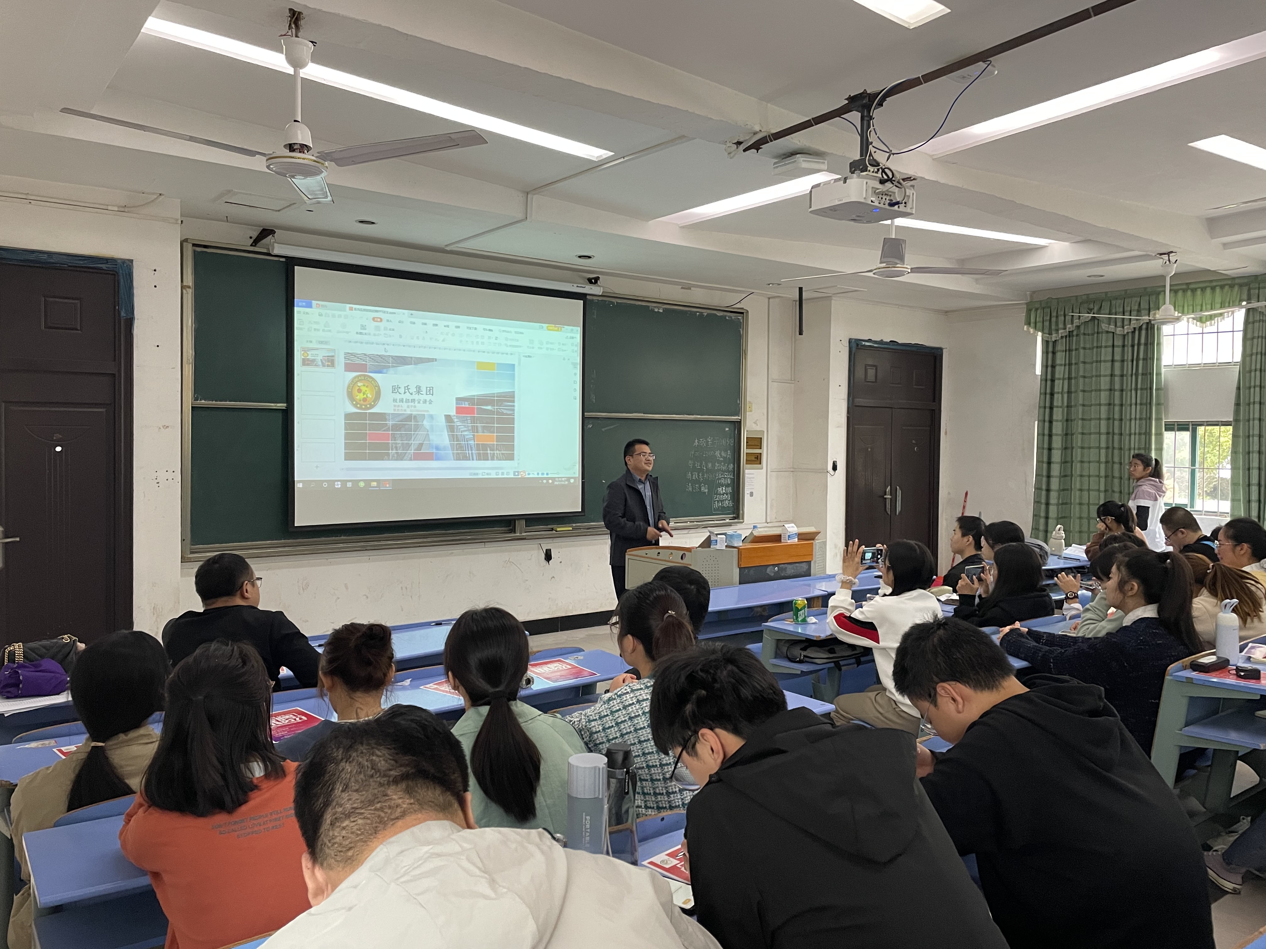 欧氏集团成立于2003年,是一所集研发、生产、销售、服务为一体,以农药原药、农作物病虫害专业化防治为核心业务的高科技公司。用人单位宣讲人首通过播放企业宣传短片,让同学们对企业有了初步了解。同时,通过PPT从行业概况、发展战略等方面进行介绍,让同学们对该公司有了更加深入的认识。