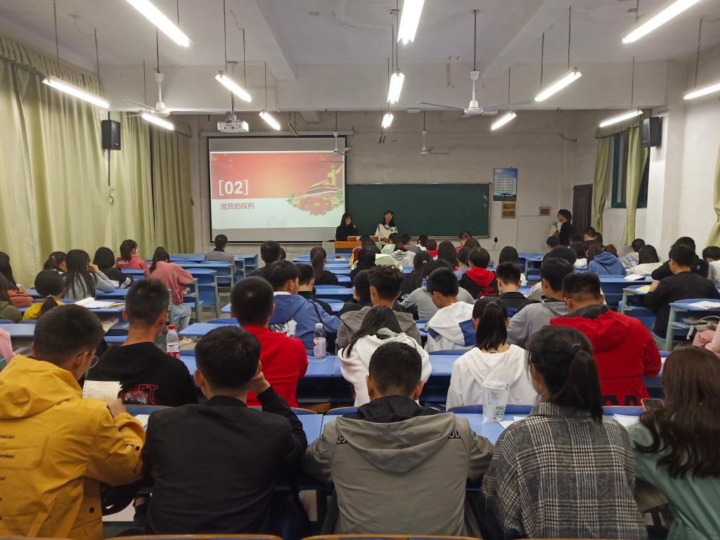 为增进我院学生对党的认识和理解,让我院学生清楚如何成为一个合格的共产党员,我院于10月25日晚在九栋106、405和501开展了三堂党课宣讲。本次党课宣讲分别是预备党员张欢、车涵静、倪若荑、雷艺涵主讲的以“学习党识,铭记责任,以实际行动争取早日入党”为主题的党课宣讲;预备党员黄义倩和舒怡主讲的以“不忘初心,牢记使命”为主题的党课宣讲;预备党员刘洁和黄琳主讲的以“把握新方位,开启新征程,如何成为一个合格的共产党员”为主题的党课宣讲。参与此次宣讲的是19级全体同学。