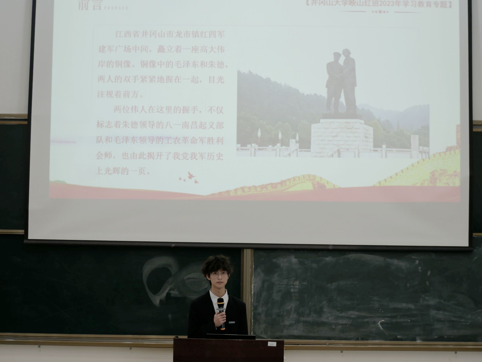 本次活动奏唱国歌中拉开序幕何旭梅介绍了井冈山胜利会师的重要意义、历史地位。黄志成以微党课的形式,从井冈山市龙市镇红四军广场中的一座高大伟岸的铜像导入主题继而从井冈山会师的概况、背景、进程、意义等八个部分带领全体成员学习了井冈山会师的历史。全体成员一起观看《光影礼赞百年——井冈山精神》视频更为直观地了解井冈山会师过程中发生的红色故事。