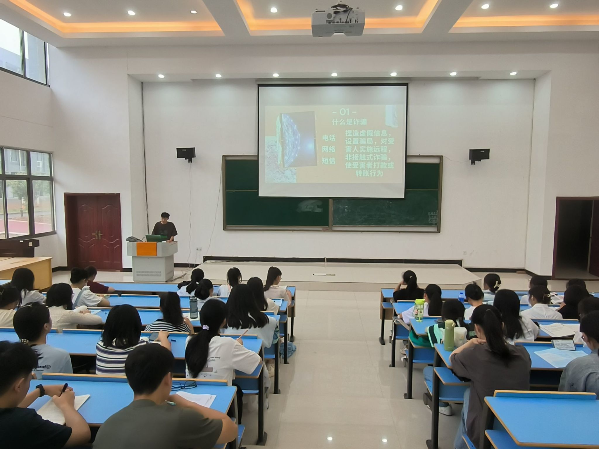 黄敬梁从“防溺水”和“反诈骗”两个部分向同学们讲解。对于防溺水,就水域的危险、溺水事故的预防、溺水的表现、溺水救援方法等知识进行了详细的讲解,让学员们充分认识到安全的重要以及生命的宝贵。对于反诈骗,首先介绍了电信网络诈骗的概念,接着结合最近发生的新型人工智能(AI)诈骗、淘宝诈骗及“培训贷”等案例,向学员们讲解了虚假征信、虚假贷款、虚假投资理财、刷单、冒充客服等常见的诈骗手段,提醒同学们在日常生活中提高自我防范意识,防止上当受骗。